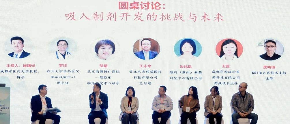 会议荣幸邀请到贺晴主任、刘波博士、刘学武博士等六位吸入领域专家,从吸入制剂的药学、安全性、有效性、器械装置等研发链的重要环节,进行专业指导与经验分享。成都中医药大学教授侯曙光博士主持了圆桌讨论,就吸入制剂开发的挑战和未来为主题展开了讨论,现场气氛热烈。