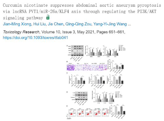 34. 烟酸姜黄素酯通过调节 PI3K/AKT 信号通路影响 lncRNA PVT1/miR-26a/KLF4 轴以抑制腹主动脉瘤焦亡