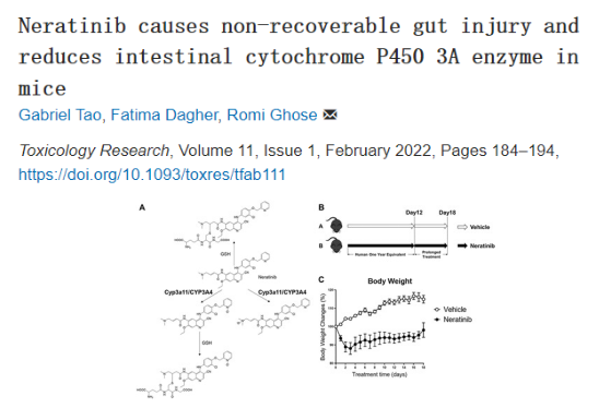16. 来那替尼造成不可恢复的肠道损伤并减少小鼠肠道细胞色素 酶P450 3A的含量和活性