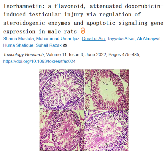 8. 异鼠李素:一种黄酮类化合物,通过调节雄性大鼠类固醇合成酶和凋亡信号基因表达减轻阿霉素诱导的睾丸损伤