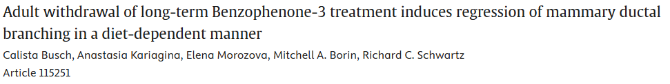 概述:长期苯并酮-3暴露后撤药可诱导小鼠乳腺导管形态学重构,且该病理效应受膳食模式调控,提示评估内分泌干扰物毒性时需整合膳食背景因素。