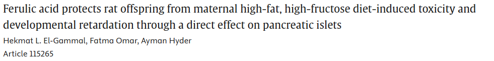 概述:阿魏酸可通过直接保护胰岛β细胞,缓解母体高脂高果糖饮食对子代造成的代谢紊乱与发育迟缓,改善糖脂代谢紊乱及性腺/肝肾发育迟缓。