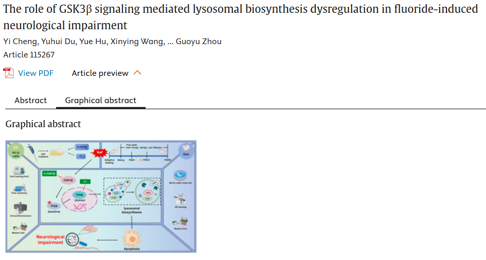 概述:氟化物通过激活GSK3β信号通路扰乱溶酶体生物合成,诱导神经元凋亡及认知功能损伤。