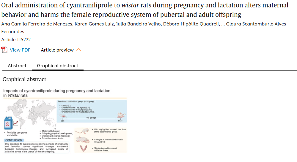 概述:妊娠与哺乳期氰虫酰胺经口暴露可诱导母鼠行为异常(哺乳时间延长、清洁行为减少),并引起雌性子代子宫组织结构异常及氧化应激升高。