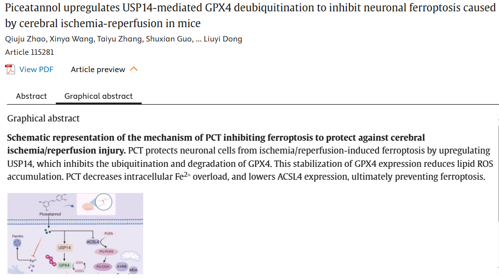 概述:白皮杉醇通过激活USP14介导的GPX4去泛素化通路抑制脑缺血再灌注诱导的神经元铁死亡,改善神经功能,为缺血性脑卒中的治疗提供了新的干预靶点。