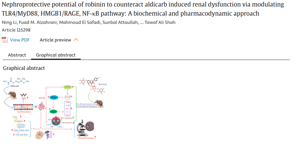 概述:洋槐苷通过调控TLR4/MyD88、HMGB1/RAGE及NF-κB炎症信号通路,缓解涕灭威诱导的肾损伤,同时改善肾功能指标(肌酐、尿素等)及组织病理损伤。