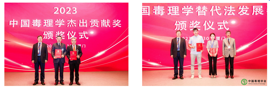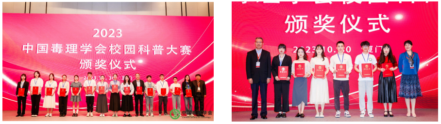大会开幕式上还表彰了 2023 年中国毒理学杰出贡献奖获得者,他们是孙祖越、陈嘉斌两位专家;表彰了 2023 年中国毒理学替代法发展奖获得者徐华、杨辉、于典科教授;表彰了学会 2023 年校园科普大赛的五个获奖单位:南华大学公共卫生学院、空军军医大学军事预防医学院、广州医科大学公共卫生学院、南京医科大学公共卫生学院、华北理工大学公共卫生学院,以及优秀参赛个人,一等奖 2 名、二等奖 5 名、三等奖 10 名、优秀奖 15 名。